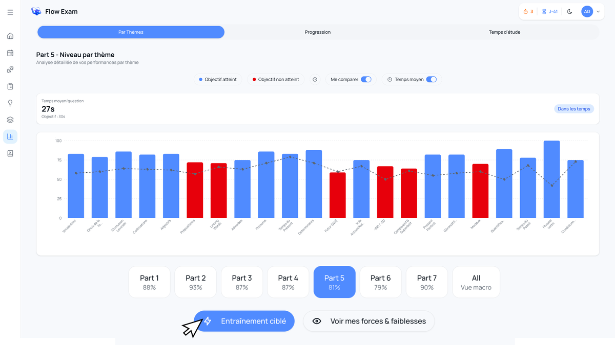 Chaque question de la plateforme est classée dans plus de 200 thèmes, ce qui permet une compréhension fine de tes erreurs, un niveau de précision qu’aucune autre plateforme TOEIC® ne propose aujourd’hui.