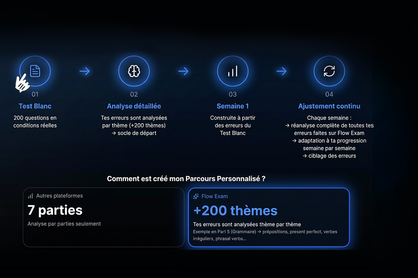 Avec les flashcards automatiques, les familles d’erreurs et la méthode de révision intégrée, les étudiants observent en moyenne +120 points rien qu’en consolidant les mots essentiels, les phrasal verbs et les expressions récurrentes.