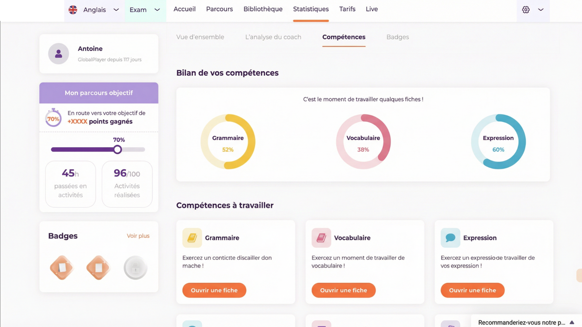 - Entraînement automatique sur tes erreurs les plus courantes (prépositions, present perfect,…)